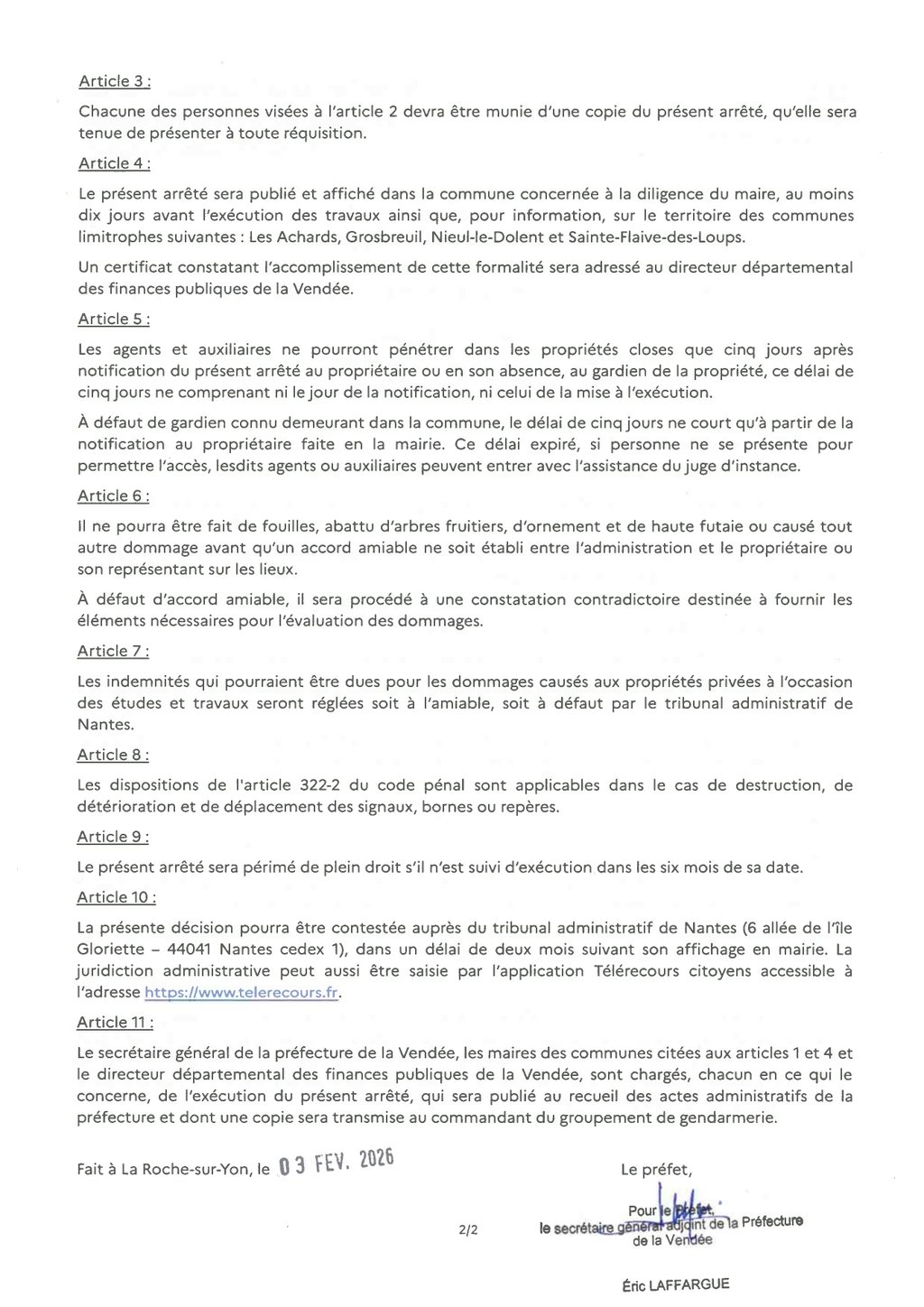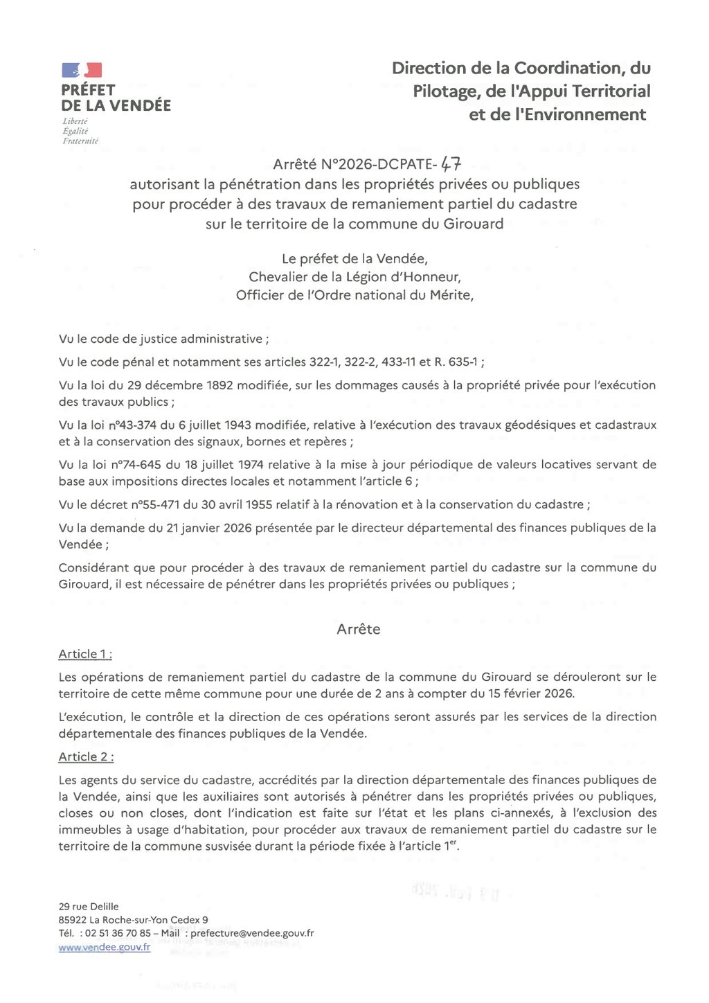 Les agents du service du cadastre accrédités par la direction départementale des finances publiques de la Vendée ainsi que les auxiliaires sont autorisés à pénétrer dans les propriétés privées ou publiques, closes ou non closes dont l'indication est faite sur l'état et les plans ci-dessous.