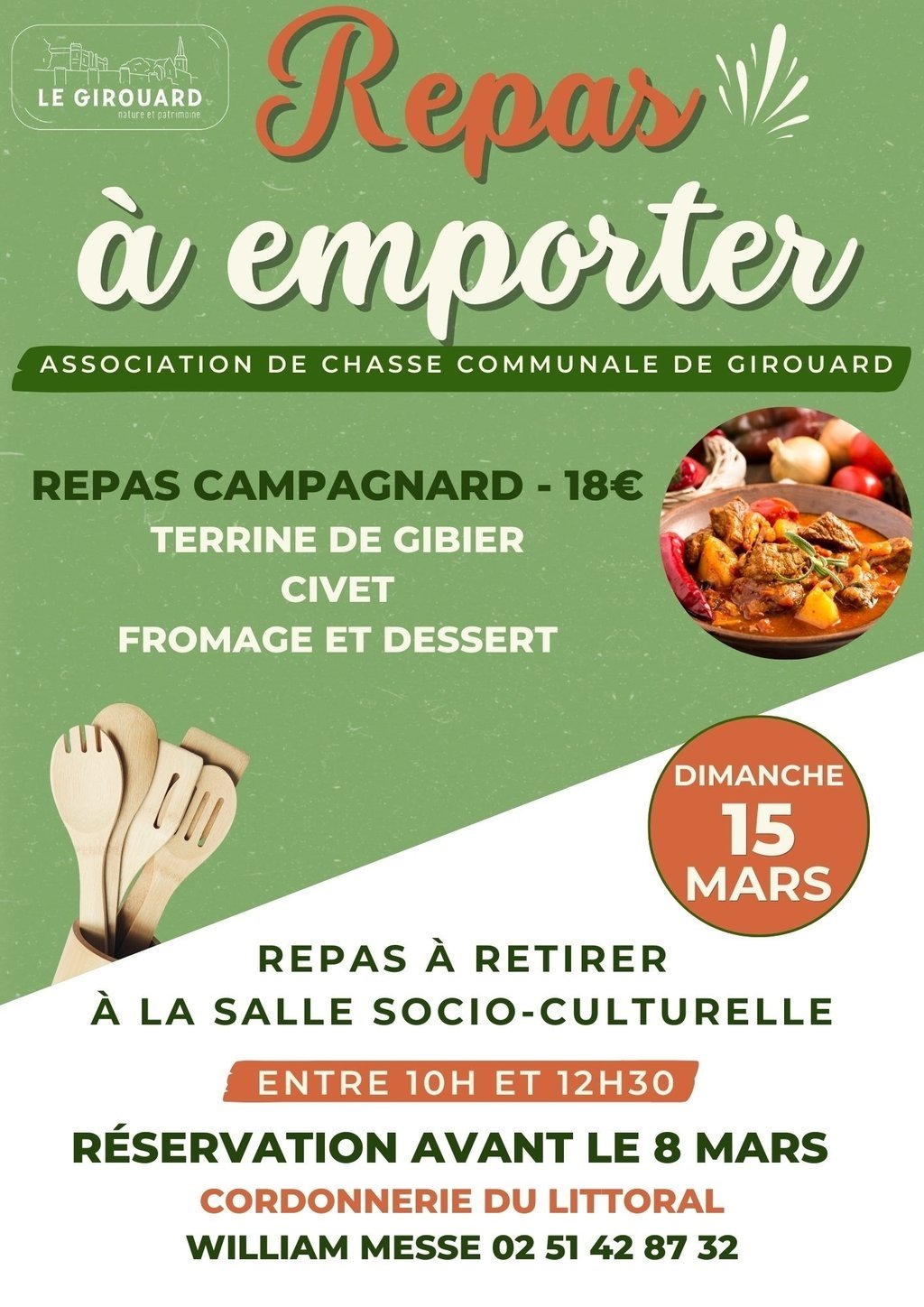 Le repas sera à retirer à la salle socio-culturelle le dimanche 15 mars entre 10h et 12h30.