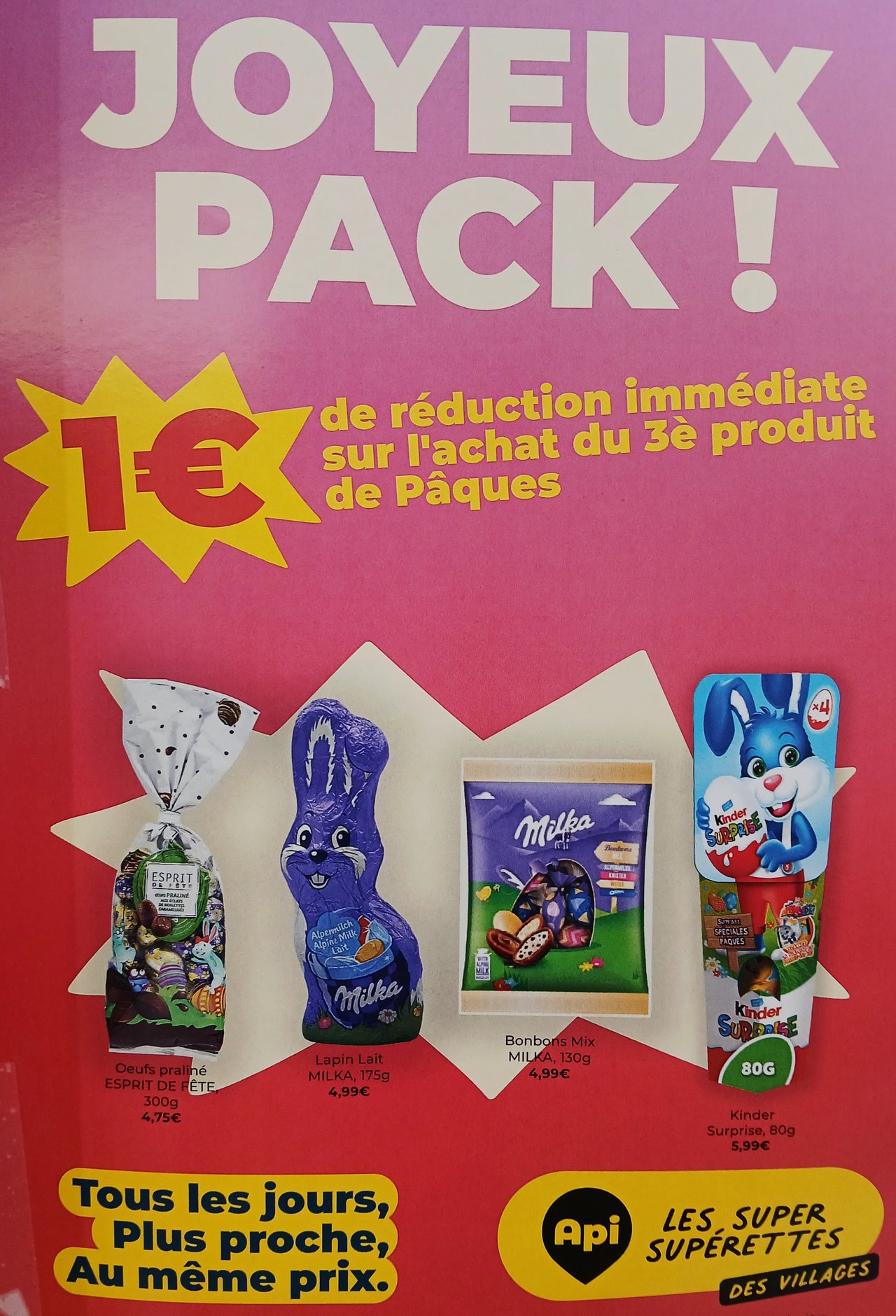 🛒 Faites le plein de chocolats pour Pâques : 1€ de réduction immédiate sur l'achat du 3ème produit de Pâques dans votre supérette Api ! 🍫