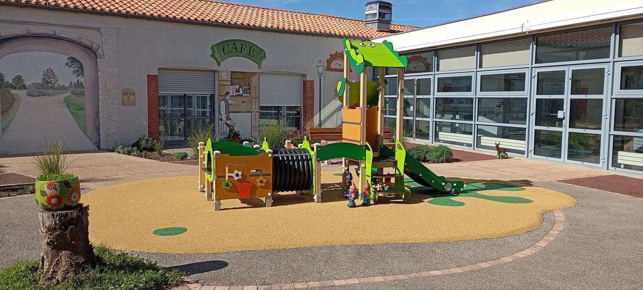 Cette aire de jeux dédiée aux tout-petits a été aménagée à proximité de la MARPA, offrant un espace entièrement pensé pour les enfants jusqu’à 3 ans.